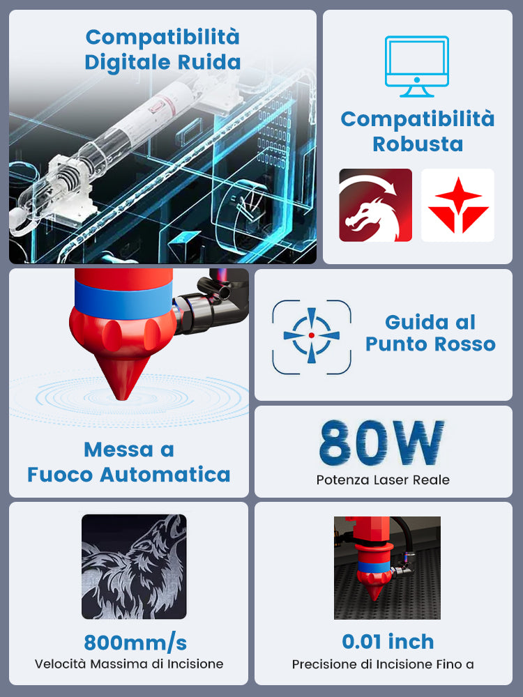 Aumenta la tua efficienza e raggiungi velocità di incisione impressionanti con la nostra macchina per incisione laser da 80 W. Il nostro dispositivo consente incisioni rapide e precise su una varietà di materiali.