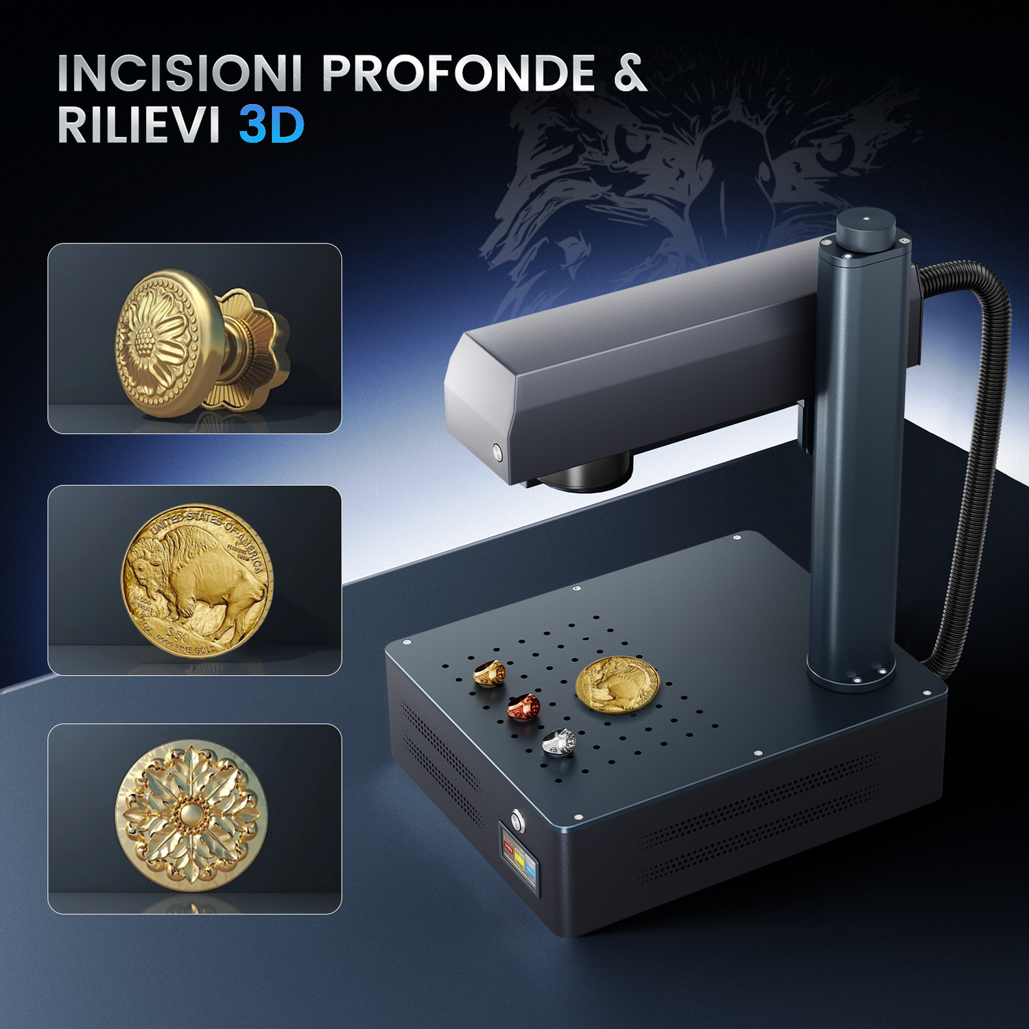 Maggiore è la potenza, maggiore è la profondità e il dettaglio che si possono ottenere nelle incisioni. Grazie alla maggiore potenza, la macchina offre risultati di incisione profonda e rilievo 3D superiori, offrendo una precisione e una profondità ineguagliabili per lavorazioni complesse. Design.