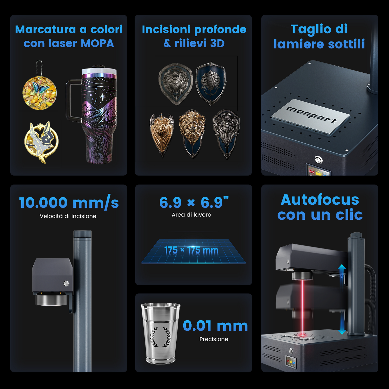 Macchina per incisione e marcatura laser in fibra MOPA integrata Monport GM 30W Pro con messa a fuoco automatica - Macchina