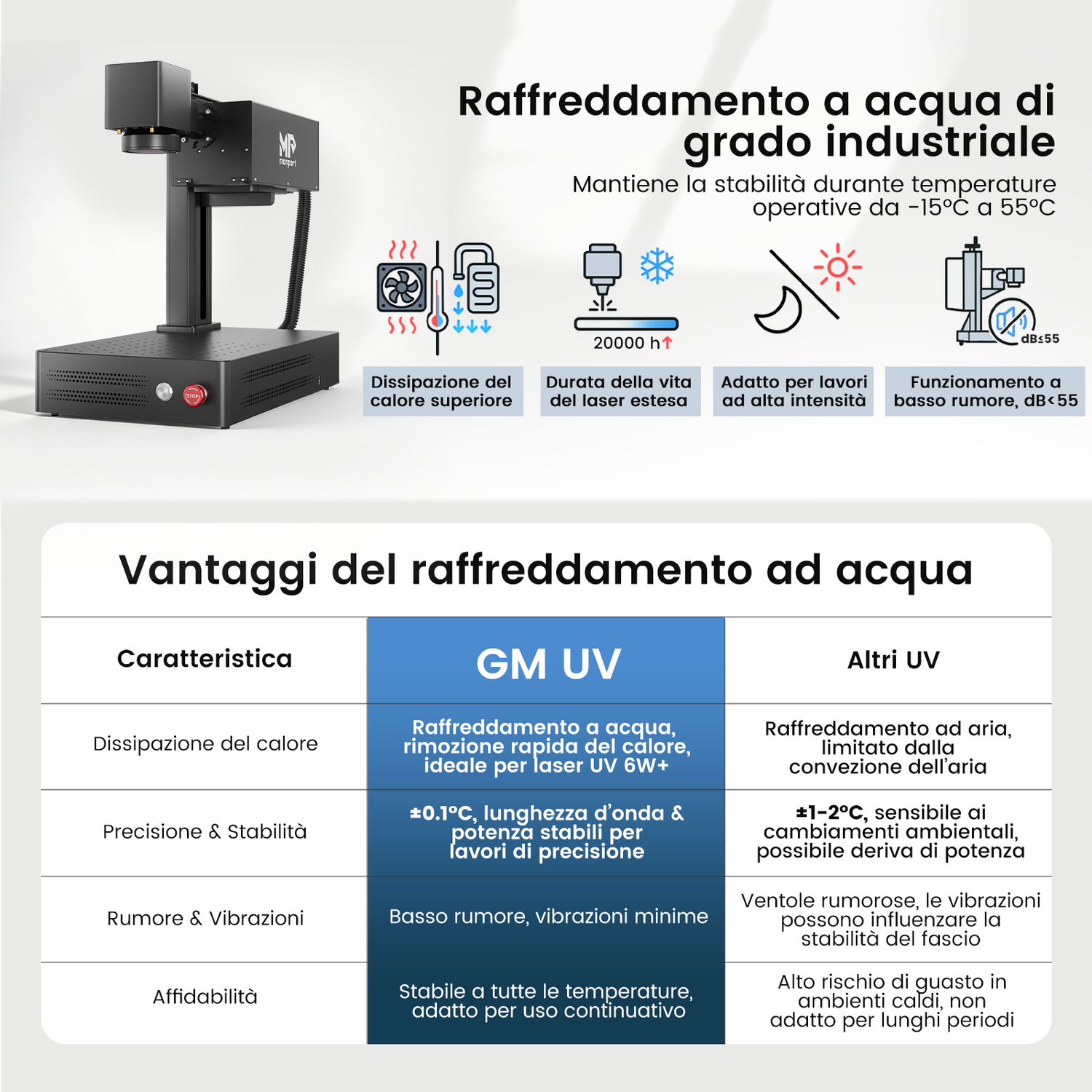 Un sistema di raffreddamento ad acqua mantiene il laser alla temperatura ottimale, garantendo prestazioni affidabili e una maggiore durata in caso di funzionamento continuo.