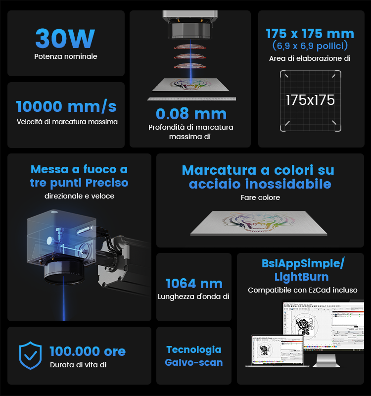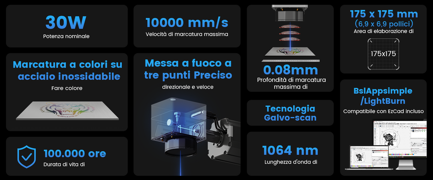 La macchina per marcatura laser a fibra Monport da 30 W, dotata di controller di marcatura 30W, garantisce elevata potenza e precisione e non pone limiti alla tua creatività e possibilità di elaborazione.