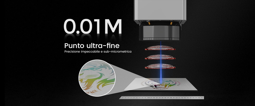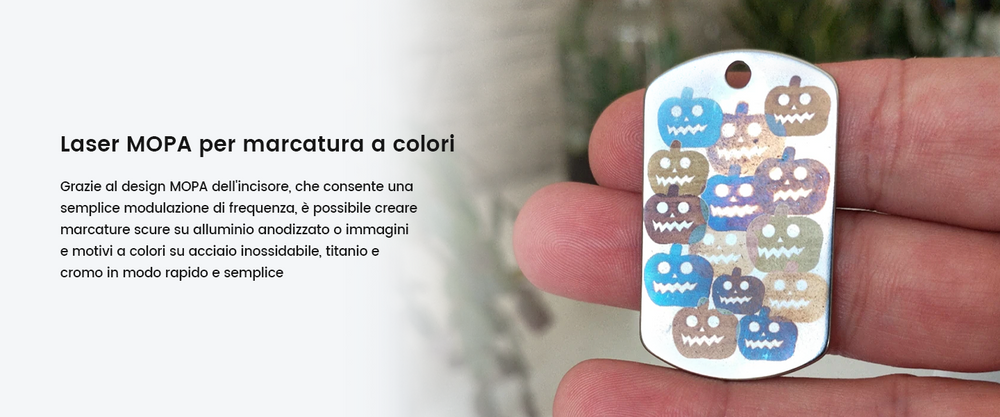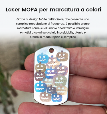 Le macchine per incisione laser a fibra sono regolabili in frequenza da 1 a 3000 kHz e larghezza di impulso da 2 a 500 ns. Ciò consente marcature vivide su acciaio inossidabile, incisioni nere su alluminio anodizzato, tagli precisi, forature e disegni complicati su bottoni in plastica. Ottieni effetti visivi ricchi e precisi con facilità.
