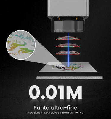 Profondità massima di marcatura in un singolo passaggio (a seconda dei materiali): 0,003 pollici (0,08 mm)