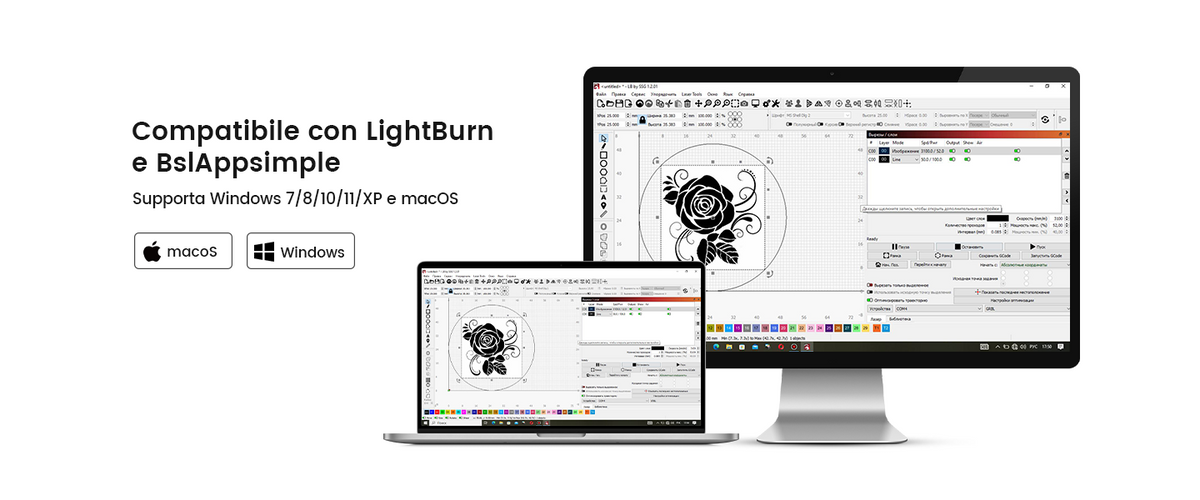 Monport è compatibile con BslAppSimple Lightburn e può essere utilizzata senza problemi su sistemi Windows e Mac. Nota: LightBurn è disponibile solo per i sistemi Mac.