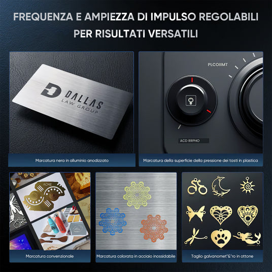Le macchine per incisione laser a fibra sono regolabili in frequenza da 1 a 3000 kHz e larghezza di impulso da 2 a 500 ns. Ciò consente marcature vivide su acciaio inossidabile, incisioni nere su alluminio anodizzato, tagli precisi, forature e disegni complicati su bottoni in plastica. Ottieni effetti visivi ricchi e precisi con facilità.