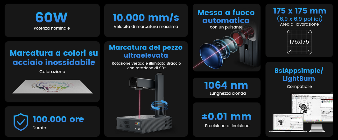 Profondità massima di marcatura in un singolo passaggio (a seconda dei materiali): 0,004 pollici (0,1 mm)