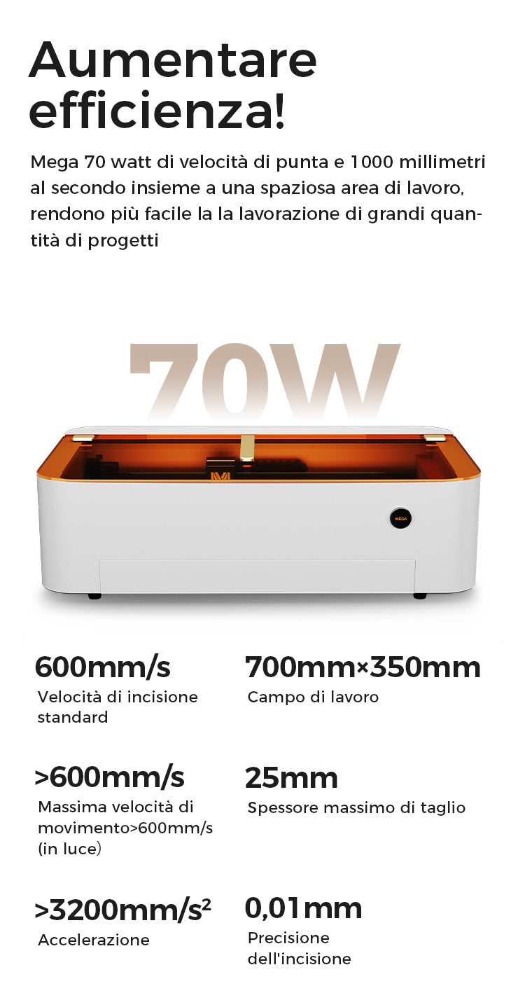 | Contenuto della confezione | Laser CO2 da 70 W * 1 Acrilico trasparente da 3 mm * 2 Pannelli in legno di tiglio da 3 mm * 5 Carta kraft * 10 Tubo flessibile e fascetta per condotto dell'aria * 1 1 litro di antigelo * 1 Adattatore per condotto dell'aria * 1 Cavo di rete * 1 Cavo USB Type-C * 1 Dispositivo di puntamento ottico * 1 Set di cacciaviti * 1 Imbuto * 1 Set di morsetti * 1 Set di chiavi esagonali * 1 Nastri adesivi * 2 Biglietti da visita * 5 Manuale utente Mega * 1 |