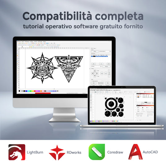 Sia Lightburn che RDWorks sono perfettamente compatibili con questa gamma di prodotti. Grazie al supporto di RDWorks, è possibile utilizzarlo insieme a software di disegno come CorelDRAW (CDR) e AutoCAD (CAD).
