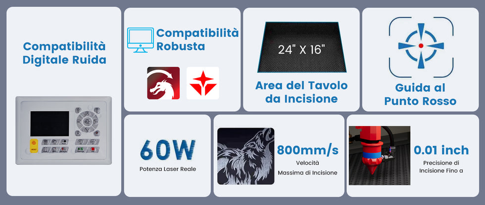 Aumenta la tua efficienza e raggiungi velocità di incisione impressionanti con la nostra macchina per incisione laser da 60 W. Il nostro dispositivo consente incisioni rapide e precise su una varietà di materiali.